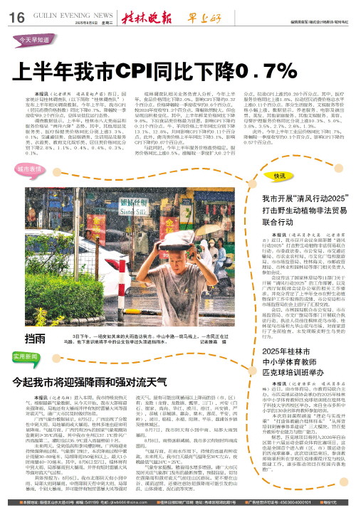 本报讯(记者谭熙 通讯员赵卢苗)昨日,国家统计局桂林调查队(以下简称“桂林调查队”)发布上半年相关调查数据,今年上半年,我市CPI(居民消费价格指数)同比下降0.7%,降幅较一季度收窄0.2个百分点,总体呈低位运行态势。
