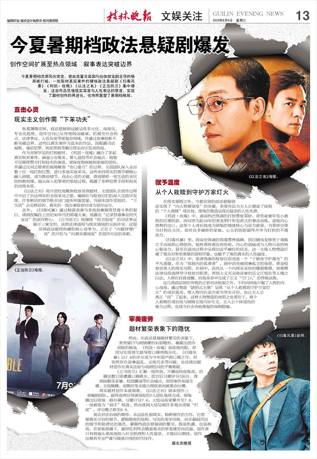 观众对法治剧的期待,永远是扎根现实、精耕细作的力作,它需要真实可信的细节、逻辑缜密的结构、写实的美学风格,而非漏洞百出的情节和脸谱化的角色。暑期档政法悬疑剧的繁荣,既是机遇,也是挑战。在密集排播下,题材红利终会随着观众的审美疲劳而消退,创作者只有将镜头更深地探入社会肌理和人性复杂,才能回应期待,创作出兼具专业严谨与情感共鸣的时代佳作。