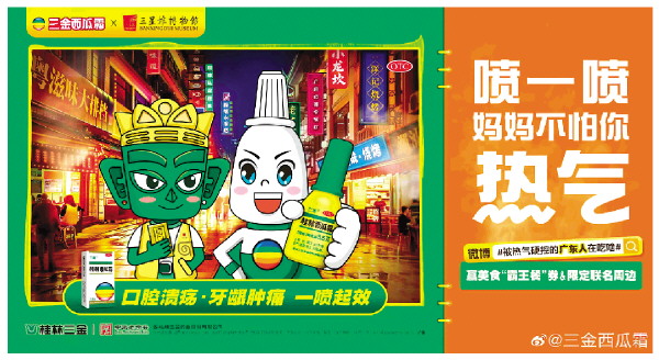 短视频实力级获奖作品《当广东之旅遇上热气对抗大师》描绘了喷仔与三星堆文物“堆堆”来到广东体验岭南“热气”饮食文化的故事。视频中,通过广东阿妈这一代表性角色,生动展现了广东人与“热气”对抗的饮食智慧,呈现了食荔枝浸盐水、宵夜配凉茶等经典场景。在制作上,该视频采用实景拍摄与鬼马动画相结合的形式,场景运用大面积撞色,带来了强烈的视觉冲击,形成了一条极具趣味性的旅游Vlog风格视频。视频采用拟人化、戏剧性的形式,让“热气”代表的地域文化、“堆堆”代表的三星堆古蜀文化与“桂林西瓜霜”代表的中医药文化三者相碰撞,既展现了三金西瓜霜与三星堆博物馆IP联名的文化传承深意,又借助轻松诙谐的叙事方式,强化了桂林西瓜霜与“热气”的功能关联,极具话题传播性。