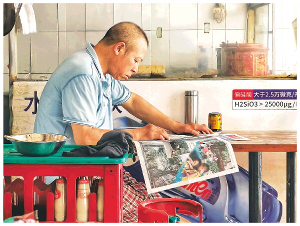 11日早上,在通泉巷的一家米粉店里,店老板在忙碌间隙阅读当天的《桂林晚报》,以了解本地的新闻资讯。