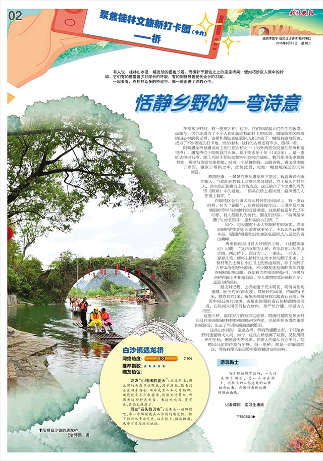 恬静乡野的一弯诗意   有人说,桂林山水是一幅流动的墨色长卷,而横卧于碧波之上的座座桥梁,便如巧妙嵌入画中的钤印。它们有的携带着岁月深长的呼吸,有的则舒展着现代设计的羽翼。