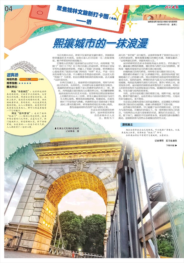 巴黎街头的凯旋门是游客们必去的打卡点,而桂林版“凯旋门”你打卡了吗?位于两江四湖上的迎宾桥,桥型设计受匈牙利布达佩斯锁桥影响,并融入了凯旋门的意象。桥两侧别出心裁地采用了我国古代城门特有的“吊桥”形式,平添一份历史的厚重与仪式感。不少圈友会专程造访迎宾桥,以这宏大的“凯旋门”为背景,拍出仿佛置身欧洲的度假风情,法式浪漫气息扑面而来。
