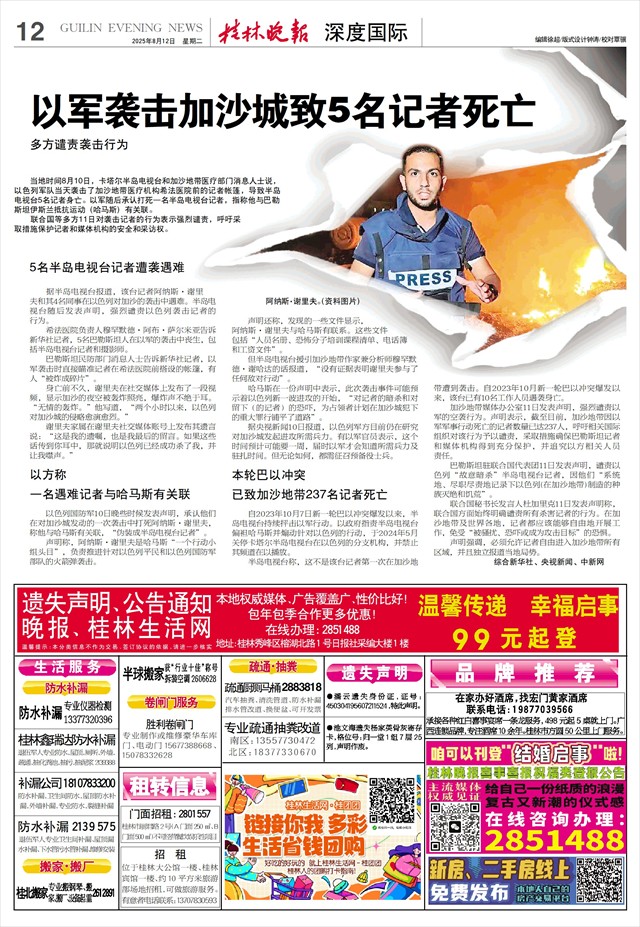 巴勒斯坦驻联合国代表团11日发表声明,谴责以色列“故意暗杀”半岛电视台记者,因他们“系统地、尽职尽责地记录下以色列(在加沙地带)制造的种族灭绝和饥荒”。