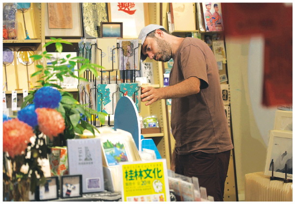 8月12日下午,在滨江路的一家书店内,一位外国游客在桂林文创产品区仔细挑选着心仪的纪念品,打算将在桂林游玩的美好记忆打包带回,日后慢慢回味。 记者邢刚 摄