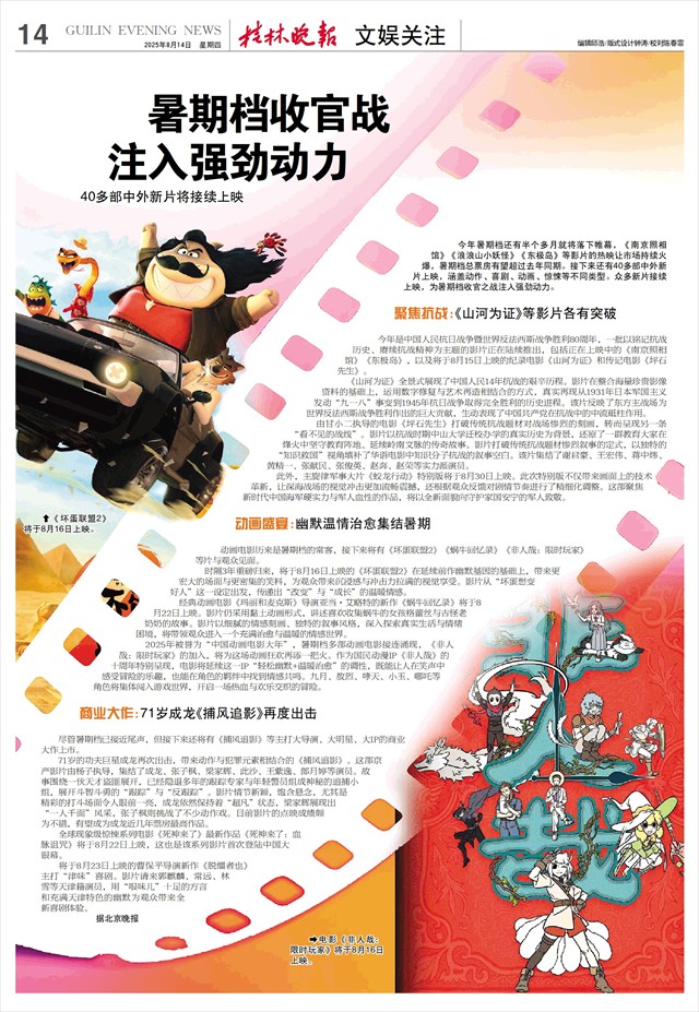 注入强劲动力 40多部中外新片将接续上映   今年暑期档还有半个多月就将落下帷幕,《南京照相馆》《浪浪山小妖怪》《东极岛》等影片的热映让市场持续火爆,暑期档总票房有望超过去年同期。接下来还有40多部中外新片上映,涵盖动作、喜剧、动画、惊悚等不同类型。众多新片接续上映,为暑期档收官之战注入强劲动力。