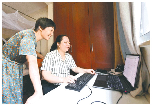 ↑8月13日,在南宁市的家中,李莹(右)在妈妈的帮助下校对文稿。 新华社发