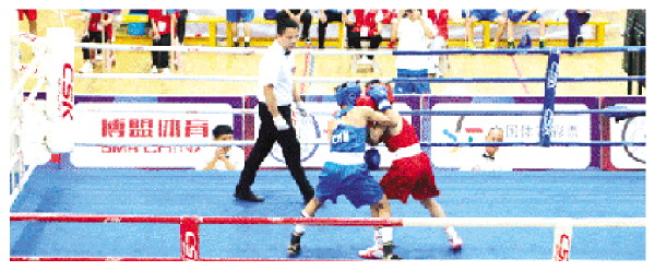 “中国体育彩票杯”广西青少年拳击锦标赛运动员激烈角逐中。