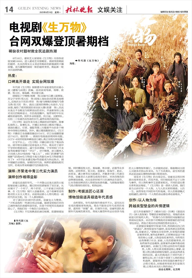 台网双爆登顶暑期档 稀缺农村题材掀全民追剧热潮   8月16日,爱奇艺大家剧场《生万物》内容热度值突破10000,进入爱奇艺荣誉殿堂。该剧凭借稀缺的题材、扎实的现实主义表达和精彩的群像演绎开播即爆,成为暑期档独树一帜的题材类型,掀起新一轮全民追剧热潮。