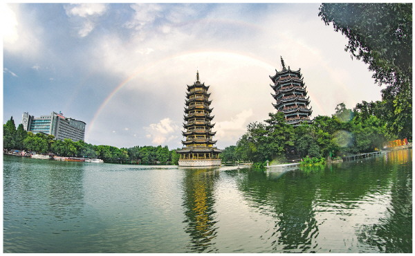 17日下午,桂林城区天空出现彩虹,这是在杉湖日月双塔附近拍摄的美景。