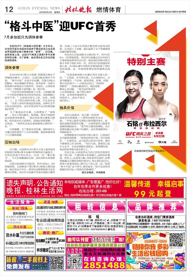 如果能够成为全职综合格斗选手,石铭或许会手握更高胜算。“我有这样的计划,但不是现在。”石铭坦言,这只是自己的UFC首秀,她并不清楚自己实力如何,“先打几场,看看自己是什么水平。未来如果能打进排名,有需要的话,我会把更多精力放在格斗上。”