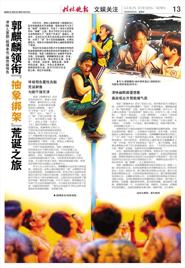 8月20日,津味儿喜剧电影《脱缰者也》发布终极预告并开启预售。预告讲述马飞为了钱“绑架”外甥屁子,开启了一场令人啼笑皆非的“抽象”之旅。影片于8月19日在天津、北京两地举行了“来到了天津卫”首映礼。活动中,主创们以天津方言向观众进行热情问候,分享了“津”彩十足的拍摄趣事,大秀玩梗实力,将影片中独特的津味儿幽默氛围带到了现场。