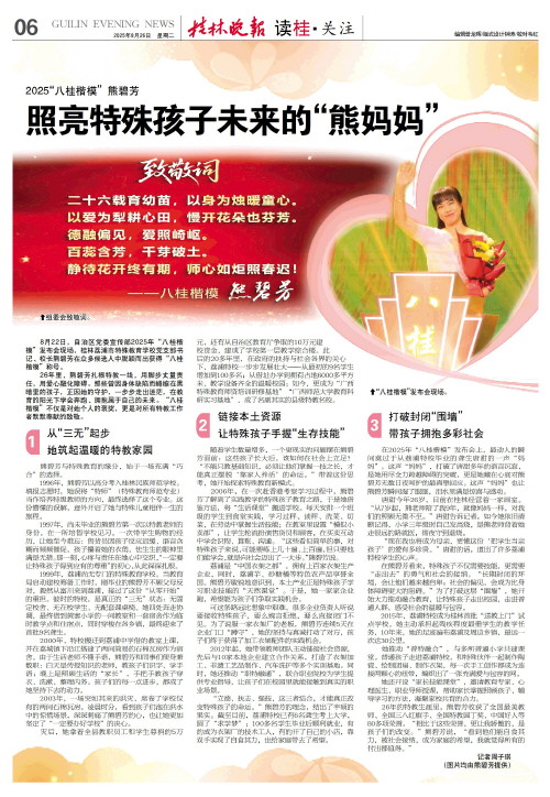 2025年“八桂楷模”发布会近日在南宁举行,桂林荔浦市特殊教育学校党支部书记、校长熊碧芳被授予2025年“八桂楷模”称号。26年里,熊碧芳扎根特教一线,用脚步丈量责任,用爱心融化障碍。