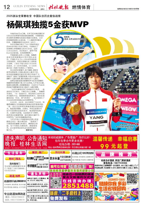 连续征战新加坡世锦赛和罗马尼亚世青赛的杨佩琪身体疲惫不堪,但斗志昂扬。几乎每天比赛,她都有金牌进账,直到赛事最后一天还在女子200米自由泳中刷新赛会纪录、提高个人最好成绩。