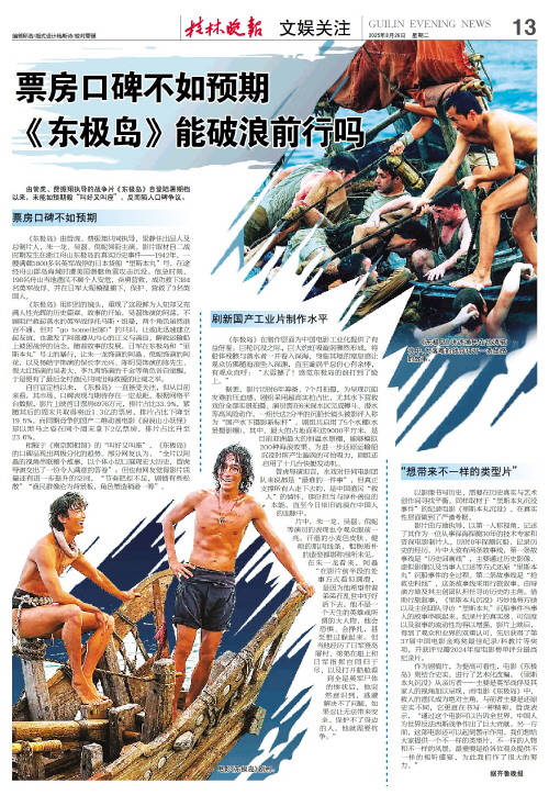 自官宣定档以来,《东极岛》一直备受关注,但从目前来看,其市场、口碑表现与期待存在一定差距。根据网络平台数据,影片上映首日票房6976万元,排片占比33.9%,紧随其后的周末共取得将近1.3亿的票房,排片占比下降至19.5%。而同期竞争的国产二维动画电影《浪浪山小妖怪》却以黑马之姿在同个周末拿下2亿票房,排片占比升至23.6%。