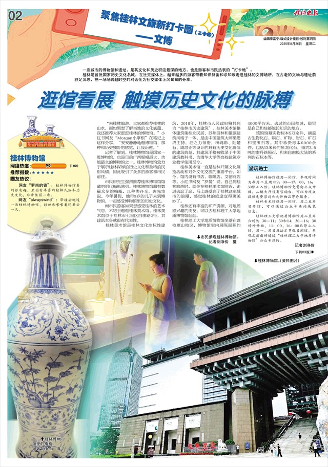 桂林是首批国家历史文化名城,在社交媒体上,越来越多的游客带着知识储备和求知欲走进桂林的文博场所,在古老的文物与遗址前驻足沉思,把一场场跨越时空的对话化为社交媒体上沉甸甸的分享。