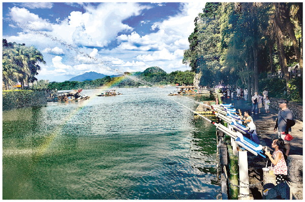 8月26日下午,在象山景区,几名小朋友在江边玩水枪,阳光照到水柱后,在空中形成了彩虹,这幅意外造就的美景给游客增添了更多乐趣。