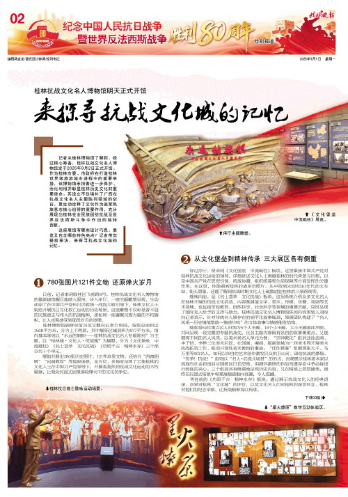 桂林抗战文化名人博物馆明天正式开馆 来探寻抗战文化城的记忆   记者从桂林博物馆了解到,经过精心筹备,桂林抗战文化名人博物馆定于2025年9月2日正式开馆。作为桂林市委、市政府在打造桂林世界级旅游城市进程中的重要举措,该博物馆承担着进一步保护、活化利用并彰显桂林历史文化的重要使命。其设立不仅填补了广西在抗战文化名人主题陈列领域的空白,更生动诠释了文化作为凝聚民族意志核心纽带的重要作用,充分展现出桂林在全民族团结抗战及世界反法西斯斗争中作出的独特贡献。