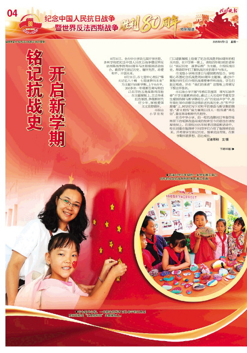 开启新学期   8月31日,全市中小学幼儿园开学注册,多所学校把纪念中国人民抗日战争暨世界反法西斯战争胜利80周年与注册报到活动结合,教育学生铭记历史、缅怀先烈、珍爱和平、开创未来。