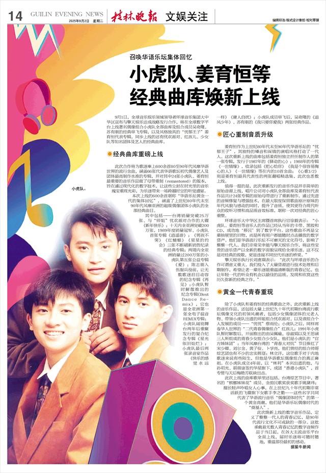 值得一提的是,此次重新发行的音乐作品并非简单的原始音源上线,唱片公司对小虎队全部曲库及姜育恒代表作品共计24张专辑的原始母带进行了重新制作。通过先进的音频修复与增强技术,在最大限度保留歌曲原汁原味的年代风貌与感动的同时,提升了音质,使其更符合现代听众的收听习惯和高品质音效标准,堪称一次对经典的匠心重塑。