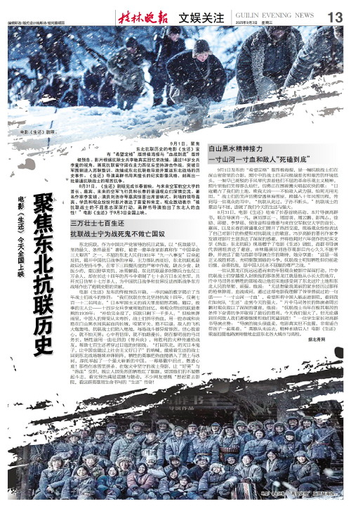 9月1日,聚焦东北抗联历史的电影《生还》发布“希望定格”版终极海报与“血战到底”版终极预告。影片根据抗联女兵李敏真实回忆录改编,通过14岁女兵李童的视角,展现抗联留守团在主力西征后坚持游击作战,突破日军围剿进入苏联整训,改编成东北抗联教导旅并重返东北战场的历史事件。《生还》导演高群书用其擅长的纪实影像风格,刻画出一批普通抗联战士的艰苦抗争。