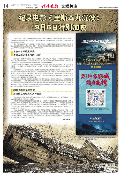 为纪念中国人民抗日战争暨世界反法西斯战争胜利80周年,由知名电影人方励担任制片人及导演的纪录电影《里斯本丸沉没》,近日宣布将于2025年9月6日,也就是影片上映一周年之际启动全国特别加映。