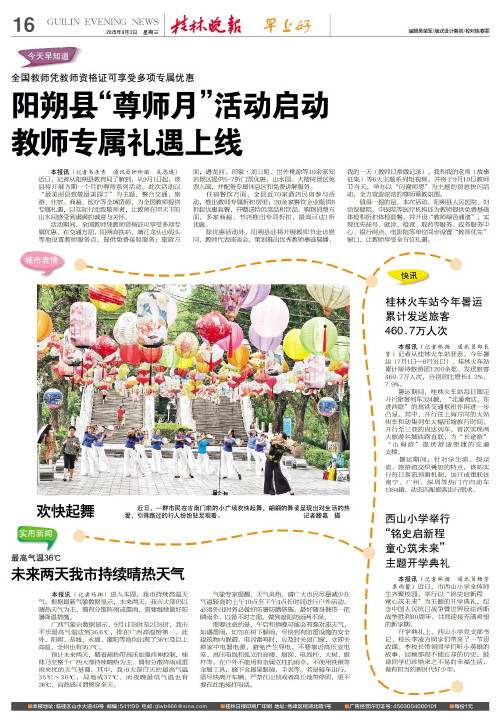本报讯(记者韦彦青 通讯员钟玲丽 吴恩逸)近日,记者从阳朔县教育局了解到,从9月1日起,该县将开展为期一个月的尊师系列活动。此次活动以“最美丽县致敬最美园丁”为主题,整合交通、旅游、住宿、商超、医疗等全域资源,为全国教师提供专属礼遇,以实际行动致敬师者,让教师在甲天下的山水间感受到满满的诚意与关怀。