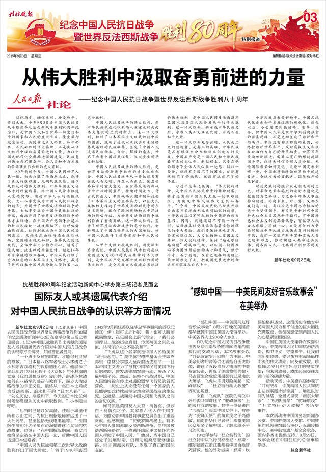 新华社北京9月2日电(记者袁睿)中国人民抗日战争暨世界反法西斯战争胜利80周年纪念活动新闻中心2日在京举办第三场记者见面会,5位为中国抗战胜利作出贡献的国际友人或其遗属代表介绍对中国人民抗日战争的认识等方面情况,并回答记者提问。