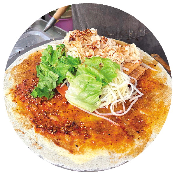 这家煎饼店的煎饼分量很足。有白面和黑米面两种面糊可以选择,黑米面糊的米香味很浓,白面糊则更软和。煎饼里可以包裹土豆丝、豆皮卷等小料,口味层次很丰富。