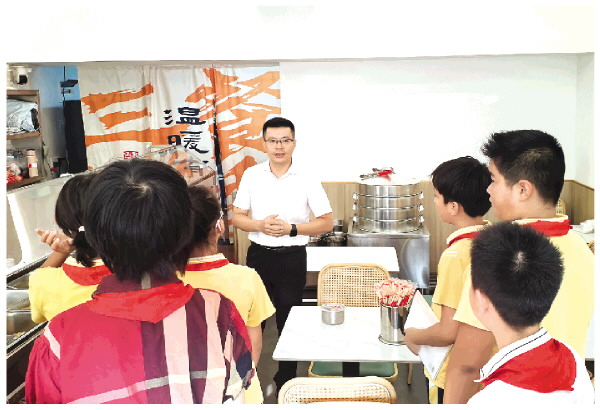 在社区民生食堂里,秀峰区全过程人民民主实践基地相关负责人向师生们介绍食堂建设由来。
