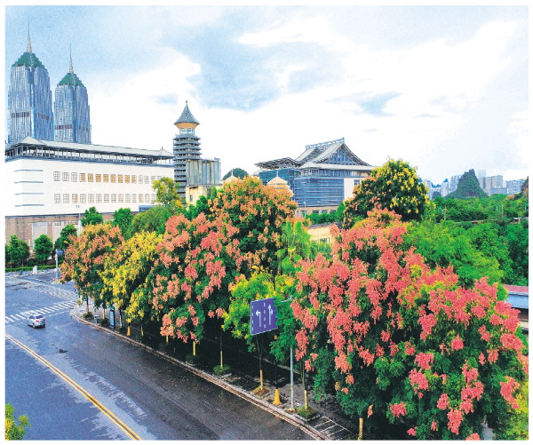 近段时间,桂林的栾树迎来大面积开花结果,有的树上满是金黄色的花朵,有的树上已经结出一串串红色的蒴果,加上绿色的树叶,缤纷的色彩形成了靓丽的街景。图为9月10日临桂区平桂路的栾树。 记者邢刚 摄