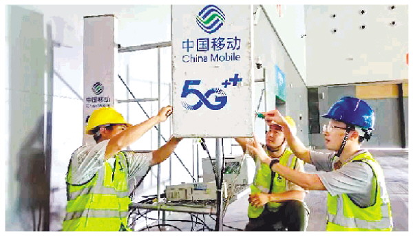 通信工程师在场馆安装5G设备。 赵娜 摄