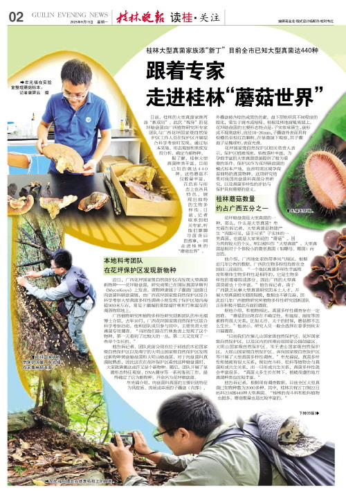 他告诉记者,根据现有调查数据,目前全区大型真菌已知物种数为2000多种。其中,桂林共有2门7纲22目85科224属440种大型真菌。“桂林的壳斗科和松科植物也挺多,蘑菇数量也是比较丰富的。”