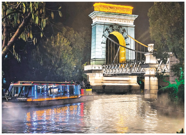 14日晚,一艘游船悠悠驶过两江四湖的迎宾桥。夜幕下,两江四湖周边的灯光将整片水域装点得如梦似幻,游客们置身其中,仿佛进入了一个奇幻的世界。 记者滕嘉 摄