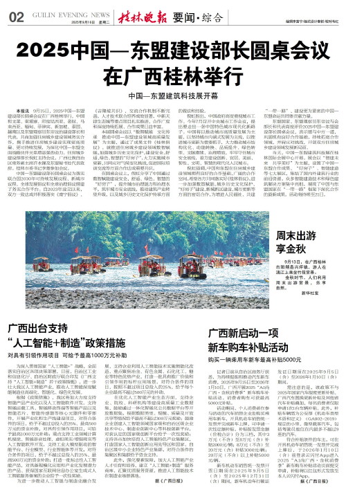 在广西桂林举行 中国—东盟建筑科技展开幕   本报讯 9月15日,2025中国—东盟建设部长圆桌会议在广西桂林举行。中国和文莱、柬埔寨、印度尼西亚、老挝、马来西亚、缅甸、菲律宾、新加坡、泰国、越南以及东盟观察员东帝汶的建设部长和代表,共商加强住房城乡建设领域务实合作,携手推进住房城乡建设实现更高质量、更可持续发展,为深化中国—东盟全面战略伙伴关系增添强劲动力。住房城乡建设部部长倪虹主持会议,广西壮族自治区常务副主席许永锞及东盟秘书处代表致辞。桂林市委书记李楚参加会议。
