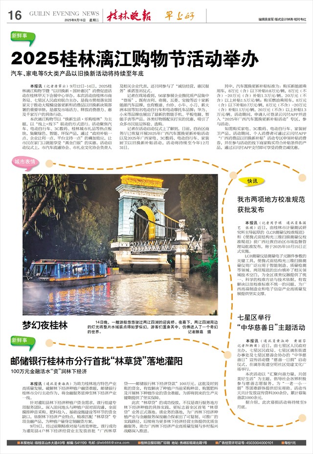 2025桂林漓江购物节活动举办 汽车、家电等5大类产品以旧换新活动将持续至年底   本报讯(记者唐霁云)9月12日-14日,2025桂林漓江购物节暨“以旧换新·国补惠民”消费促进活动在桂林甲天下会展中心举办。本次活动由桂林市商务局、七星区人民政府联合主办,是我市贯彻落实国家关于推动大规模设备更新和消费品以旧换新决策部署的重要举措,是激发市场活力、释放消费潜力、惠及千家万户的具体行动。