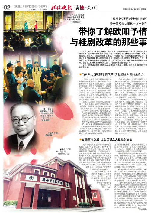 与桂剧改革的那些事   近日,CCTV1黄金档热播剧《阵地》中,一段桂剧演出的情节引发关注。剧中第六集里,白崇禧邀请周恩来及众多文化人士观看桂剧,然而演出内容低俗,众人纷纷离场。剧场外,周恩来向白崇禧表示:“在我看来,桂剧的曲调和桂林山水一样美,只是内容脱离现实,如果在内容上做一些调改,桂剧还是很有希望的。”这一情节不仅让广西桂剧走进了大众视野,也引出了后续马君武力邀欧阳予倩改革桂剧的故事,引发了人们对欧阳予倩如何让这一本土剧种焕发生机的好奇。