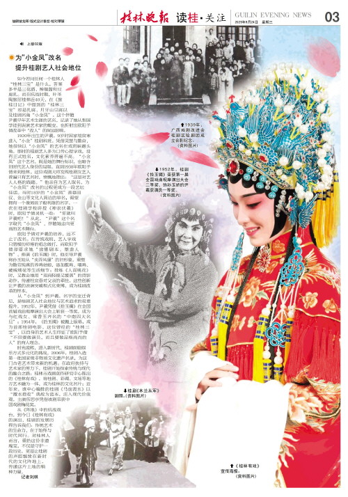 如今若问任何一个桂林人“桂林三宝”是什么,答案多半是三花酒、辣椒酱和豆腐乳。而在抗战时期,叶圣陶旅居桂林近40天,在《旅桂日记》中提到的“桂林三宝”却是乳腐、月牙山豆腐以及桂剧名角“小金凤”。这个伴随尹羲早年艺术生涯的艺名,记录了她从梨园学徒到表演艺术家的蜕变,也折射出欧阳予倩改革中“改人”的深远影响。