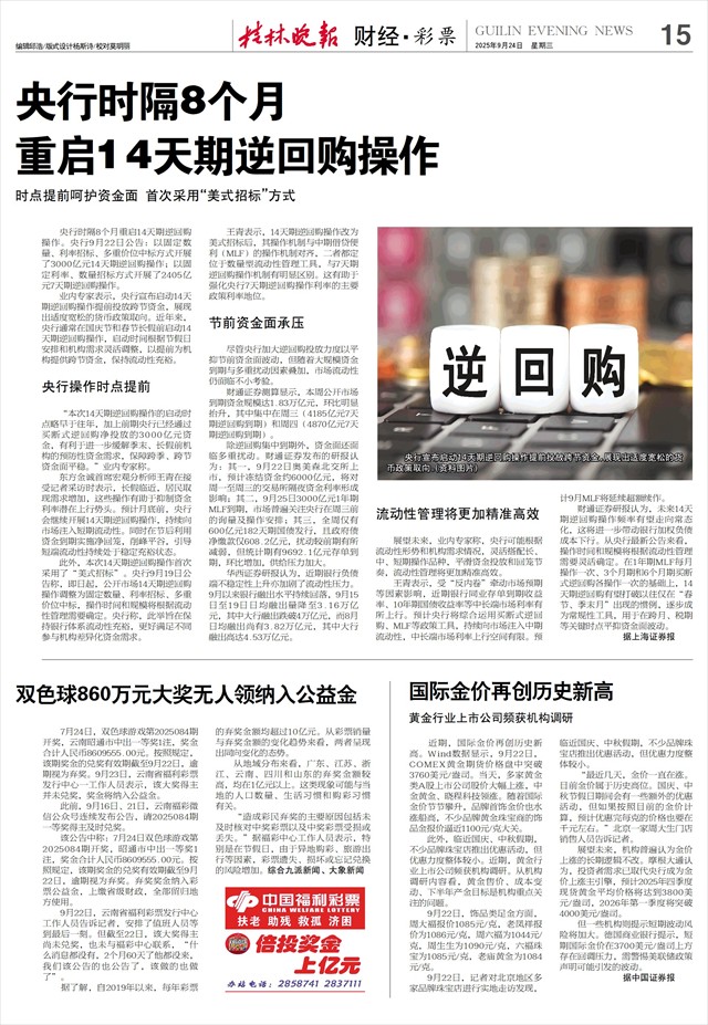 “本次14天期逆回购操作的启动时点略早于往年,加上前期央行已经通过买断式逆回购净投放的3000亿元资金,有利于进一步缓解季末、长假前机构的预防性资金需求,保障跨季、跨节资金面平稳。”业内专家称。