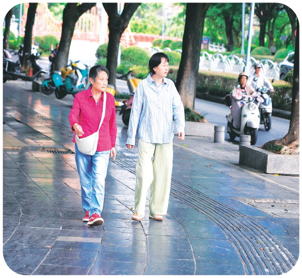 受台风外围环流影响,这两天桂林市区气温只有二十多度,人们纷纷脱下夏装换上秋衣。图为24日下午,两位穿着长衣长裤的市民经过丽君路。 记者邢刚 摄