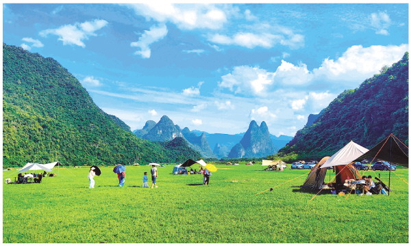 近段时间,桂林的“呼伦贝尔”——永福县罗锦镇金鸡河水库大草原再度火爆网络。据了解,每年夏季是金鸡河水库蓄水期,入秋后水位逐步回落,大片滩涂变成了天然的超大草坪,成为秋日桂林周边游的热门地。图为9月27日,蓝天白云下,市民游客在草坪露营游玩,享受惬意周末。 记者邢刚 摄