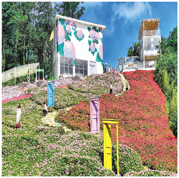 近日,桂林尧山景区的三色花海平台鲜花盛开,目之所及尽是姹紫嫣红,吸引了众多市民游客前来登山赏花。 记者滕嘉 摄
