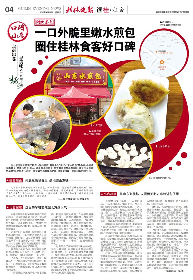 如今,“奚记山东水煎包”不仅在屏风路站稳脚跟,还在棠棣之华开了分店,甚至注册了商标。谈及未来,王学林和奚伟满眼期待:“想再开几家分店,把‘奚记’做得更好,让更多桂林人吃到正宗北方味,让这份山东来的烟火气,暖更多人的胃与心。”