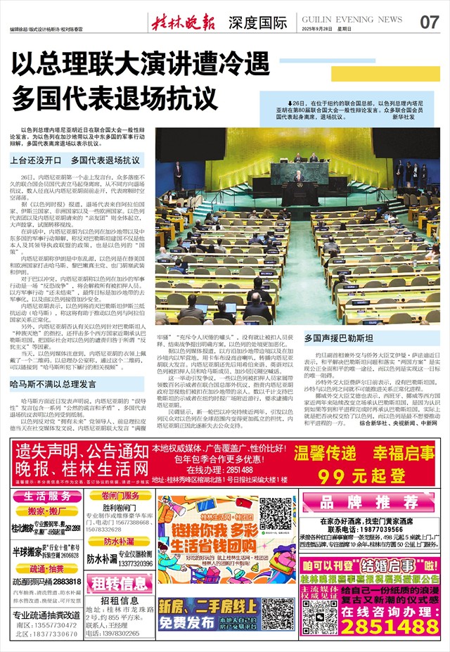 以色列总理内塔尼亚胡近日在联合国大会一般性辩论发言,为以色列在加沙地带以及中东多国的军事行动辩解,多国代表离席退场以表示抗议。