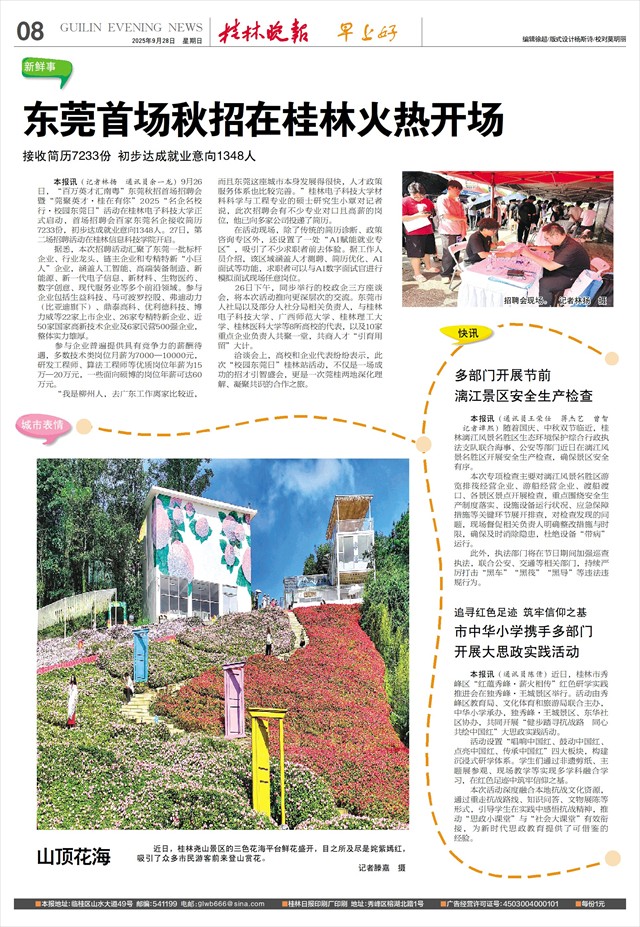 本报讯(记者林扬 通讯员余一龙)9月26日,“百万英才汇南粤”东莞秋招首场招聘会暨“莞聚英才·桂在有你”2025“名企名校行·校园东莞日”活动在桂林电子科技大学正式启动,首场招聘会百家东莞名企接收简历7233份,初步达成就业意向1348人。27日,第二场招聘活动在桂林信息科技学院开启。