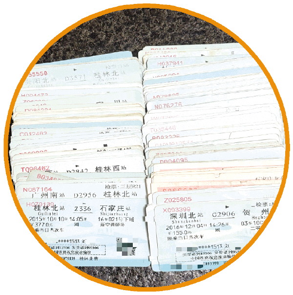 “这是2014年9月从桂林去广州的票,还是普通的绿皮车。K字头,要坐11个小时。而这张2015年3月去广州的票,已经是D字头的动车了,只要两个多小时。”
