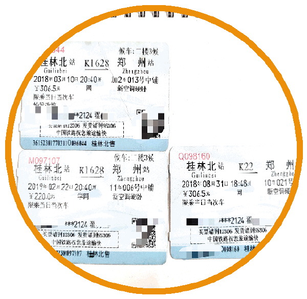 市民翟秀兰的抽屉里整齐排列着20多张火车票,有红色票也有蓝色票。最上面的3张票,是从桂林北站到郑州站的火车票,票面已经泛黄,但上面的字迹依然清晰可辨,乘车时间分别是2018年3月、2018年8月和2019年2月。