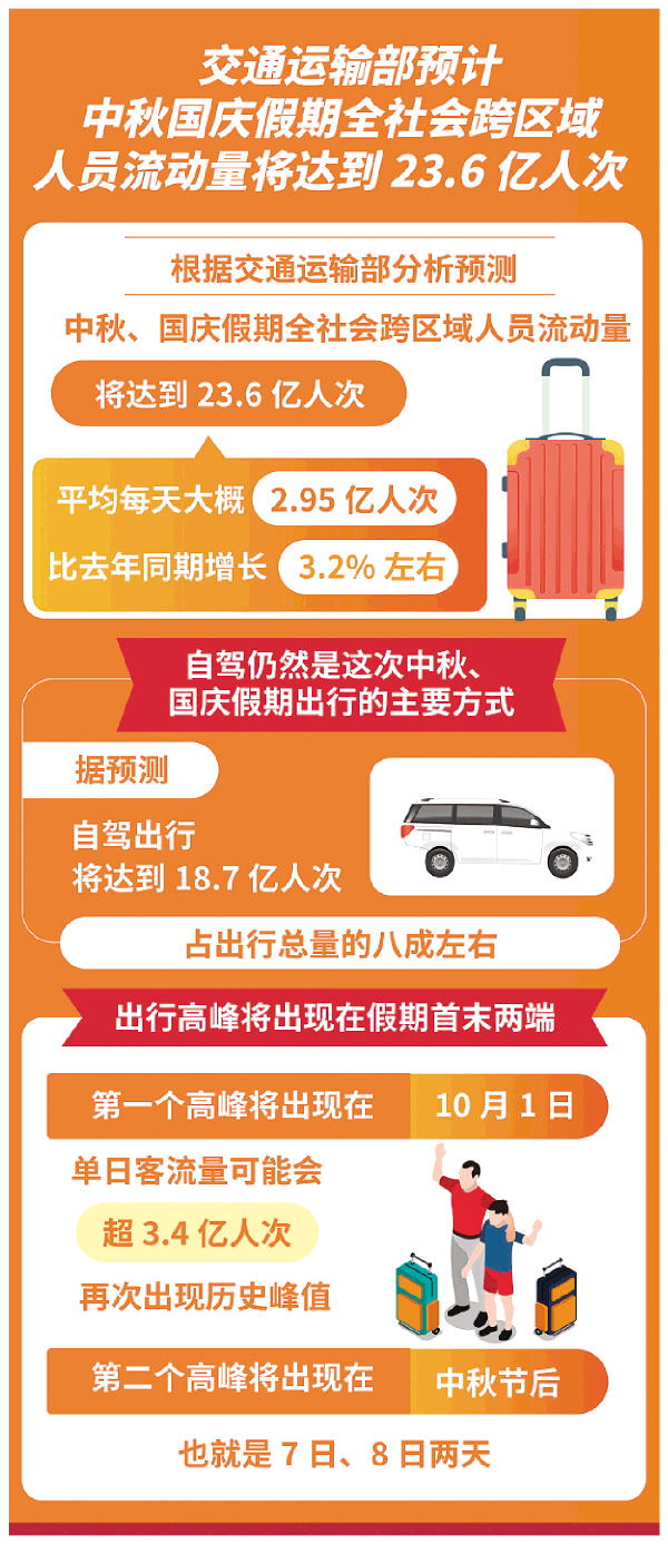根据交通运输部分析预测,中秋、国庆假期全社会跨区域人员流动量将达到23.6亿人次,平均每天大概2.95亿人次,比去年同期增长3.2%左右。