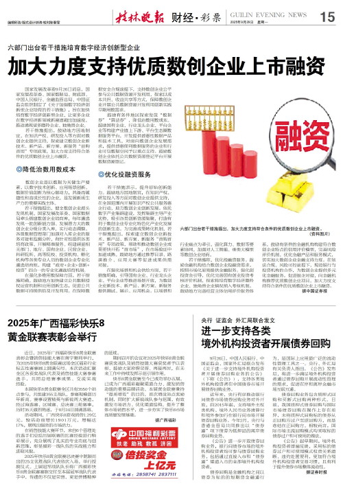 若干措施称,优化投融资服务。鼓励金融机构结合数创企业投融资需求,按照市场化原则提供金融服务。强化创投资金引导,优化完善国有创业投资考核评价机制,探索将培育数字经济瞪羚企业、独角兽企业情况纳入考核机制。鼓励地方完善经营主体信用评价服务体系,鼓励有条件的金融机构构建符合数创企业特点的信用评价模型,完善风险评价机制,优化金融产品和服务模式,切实加大数创企业金融支持力度。在依法合规、风险可控前提下,规范银行与投资机构的合作,为数创企业提供多元化金融服务。促进银企对接,向金融机构推荐优质数创企业项目。加大力度支持符合条件的优质数创企业上市融资。