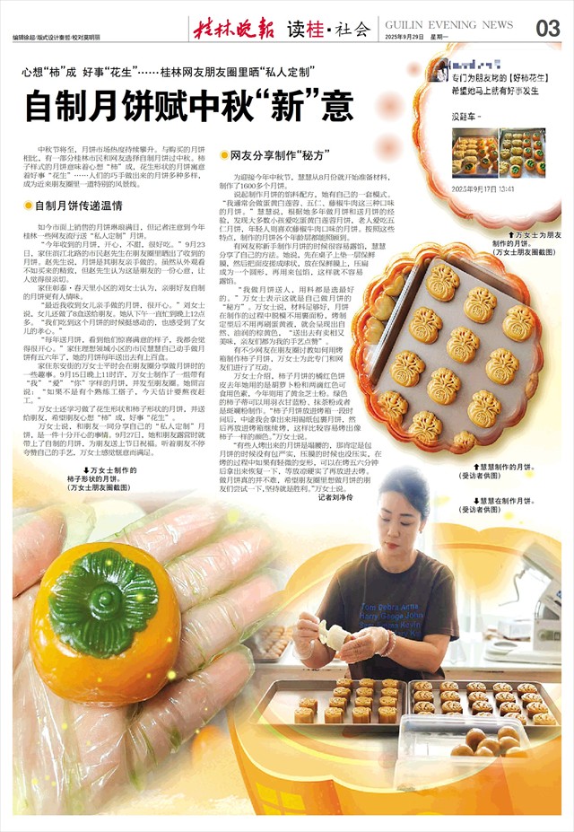 心想“柿”成 好事“花生”……桂林网友朋友圈里晒“私人定制” 自制月饼赋中秋“新”意   中秋节将至,月饼市场热度持续攀升。与购买的月饼相比,有一部分桂林市民和网友选择自制月饼过中秋。柿子样式的月饼意味着心想“柿”成,花生形状的月饼寓意着好事“花生”……人们的巧手做出来的月饼多种多样,成为近来朋友圈里一道特别的风景线。