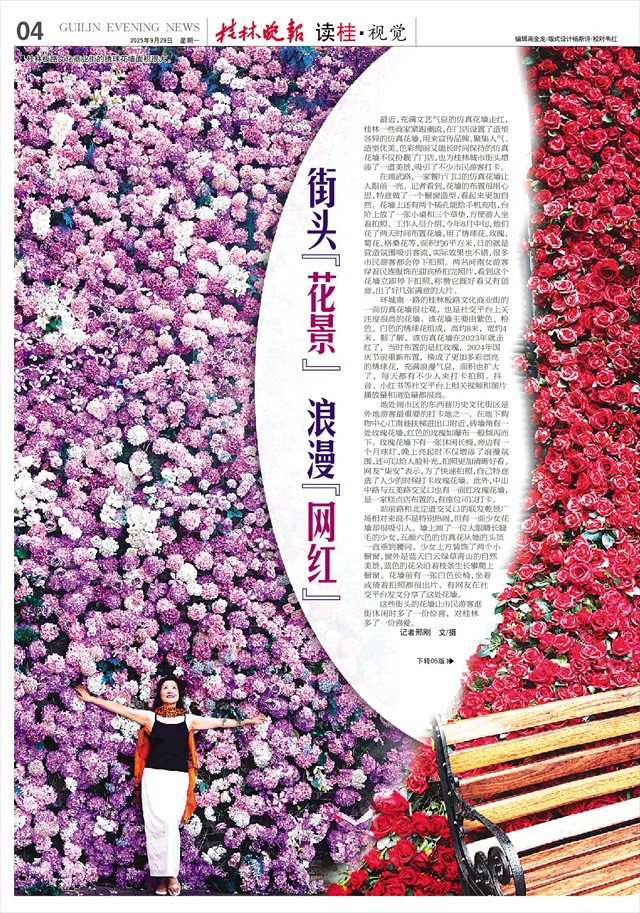 街头“花景” 浪漫“网红”   最近,充满文艺气息的仿真花墙走红,桂林一些商家紧跟潮流,在门店设置了造型各异的仿真花墙,用来宣传品牌、聚集人气。造型优美、色彩绚丽又能长时间保持的仿真花墙不仅扮靓了门店,也为桂林城市街头增添了一道美景,吸引了不少市民游客打卡。